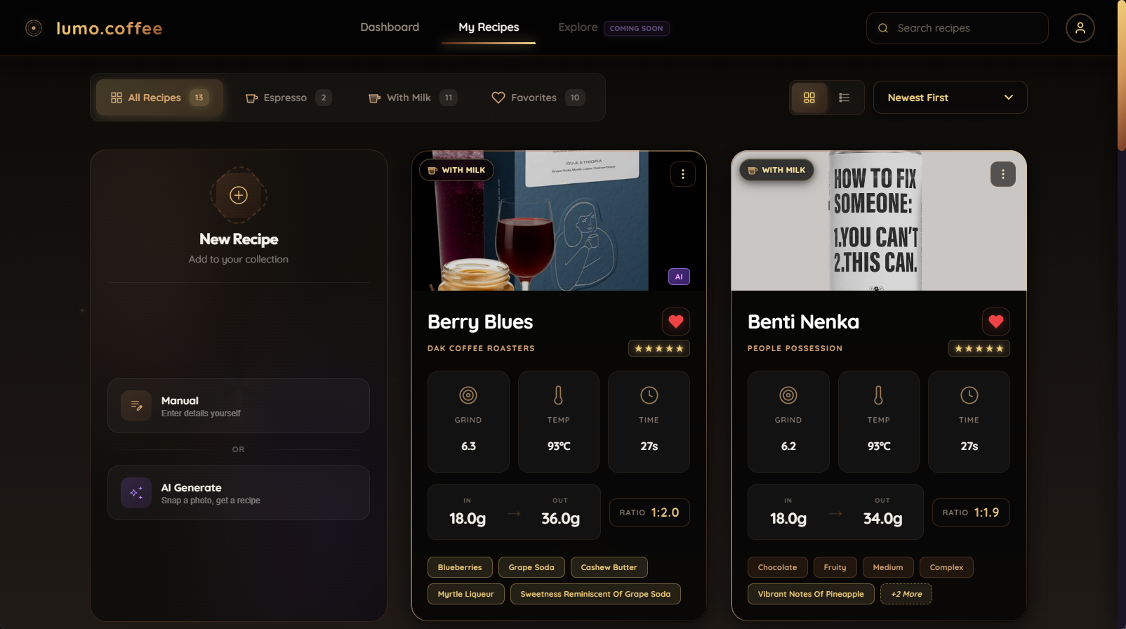 Lumo is a smart espresso recipe app that creates precision recipes for YOUR specific machine and grinder—so you dial in new coffees in 2 minutes instead of 30.